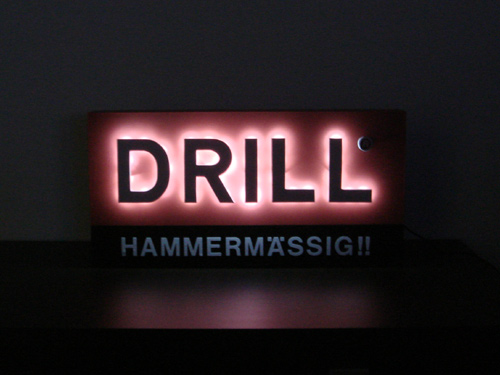 ich habe heute ein kleines Projekt gestartet. Es geht um einen Schriftzug, der indirekt, also von der Rückseite beleuchtet sein sollte. Die 10cm grossen Buchstaben stehen ca. 8mm vom roten Hintergrund ab. Sie sollen nun mit 23 (?) weissen LED's indirekt beleuchtet werden. Hier mal eine Skizze: