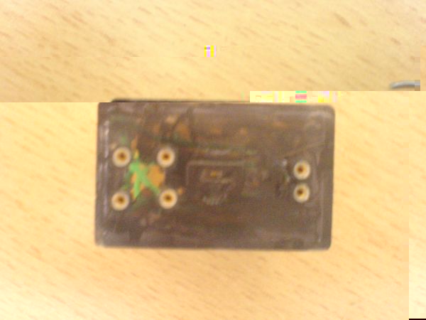 Hier einmal die Seitenansicht, in der oberen Hälfte die kleine Platine mit den zwei Widerständen und den beiden Transistoren (siehe Schaltplan)im unteren Bereich das BLaue sind drei Knopfbatterien in Reihe geschaten und mit Isolierband versehen
