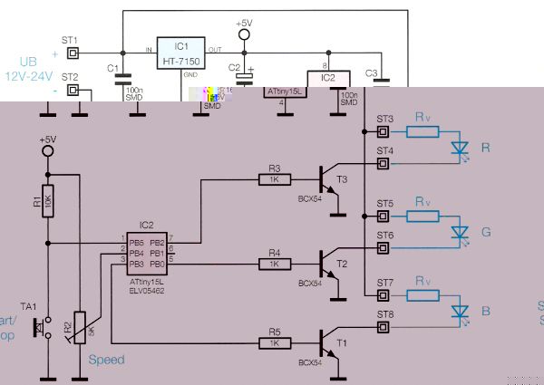 Mehr oder weniger Spannung gibst Du dann übere drei Potis, so dass sich die Farben entsprechend der Potis mischen.