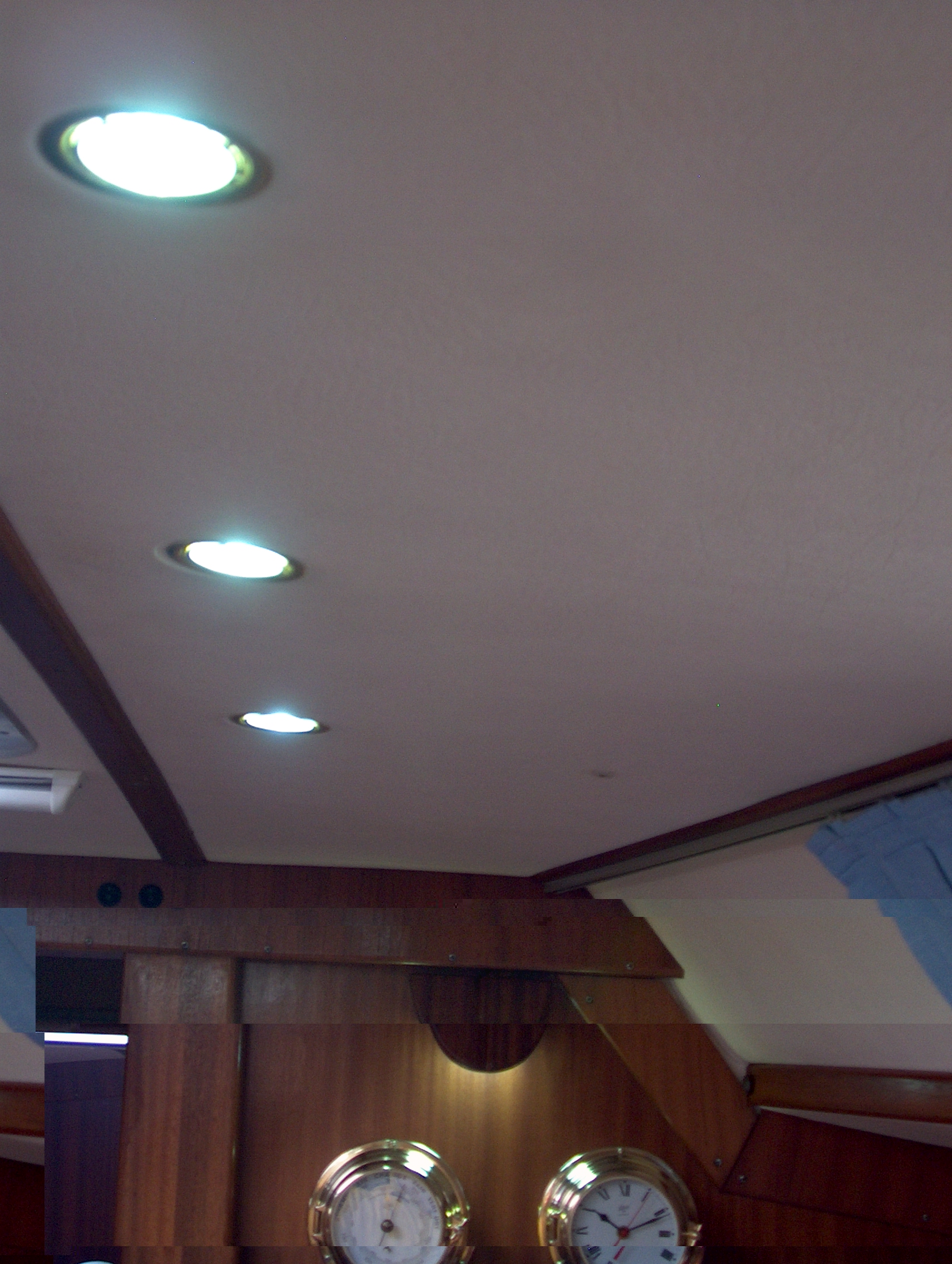 Die Lampe über dem Kartentisch habe ich mit einer Leiste roten Superflux und einer Leiste warmweissen Superflux ausgestattet. Die roten als Nachtbeleuchtung. Damit stört dieses Licht den Rudergänger nicht mehr.