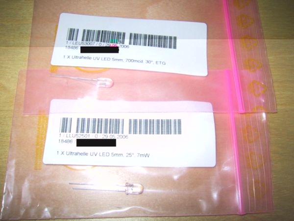 ********* Ultrahelle UV LED 5mm, 25°, 7mW € 0,98 @20mA :