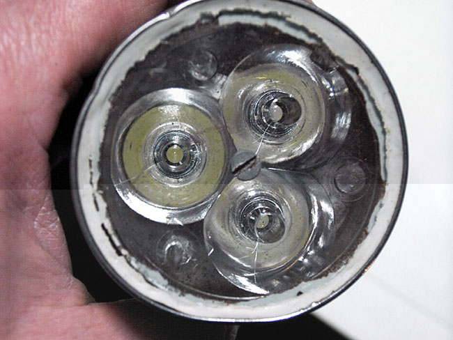 Was das Gewicht der Lampe am Helm angeht, so ist es nicht höher als bei vergleichbaren industriellen Kopfleuchten für unter Tage, vielleicht mit Ausnahme der allerneuesten Lampen. Natürlich baut die Lampe etwas länger, was aber nicht störend bei der Benutzung ist. Man geöhnt sich sehr schnell daran. Das Gehäuse ist aus Weißblech (stabil, reißfest und gut wärmeleitend, deshalb schon sehr leicht. Das Hauptgewicht wird von der Kühlwasserfüllung und den eingelöteten Kupferblechen im Inneren des Gehäuses gebildet, in meinem Fall ca. 80 - 100 g. Es ist möglich, hier noch durch entsprechende Gehäusegestaltung etwas Kühlflüssigkeit zu reduzieren, was natürlich auch das Gesamtgewicht nochmals verringern würde. Bin schon bald beim Bau einer neuen Leuchte mit ähnlichem Grundprinzip, aber verbessert. Zur Zeit experimentiere ich dahingehend, den Betrieb von 3 Stück P4 mit Tripelreflektor auf kleinstem Raum mit dem minimal notwendigsten Kühlwasserumfang bei 1000 mA Dauerbetriebsstrom zu optimieren.