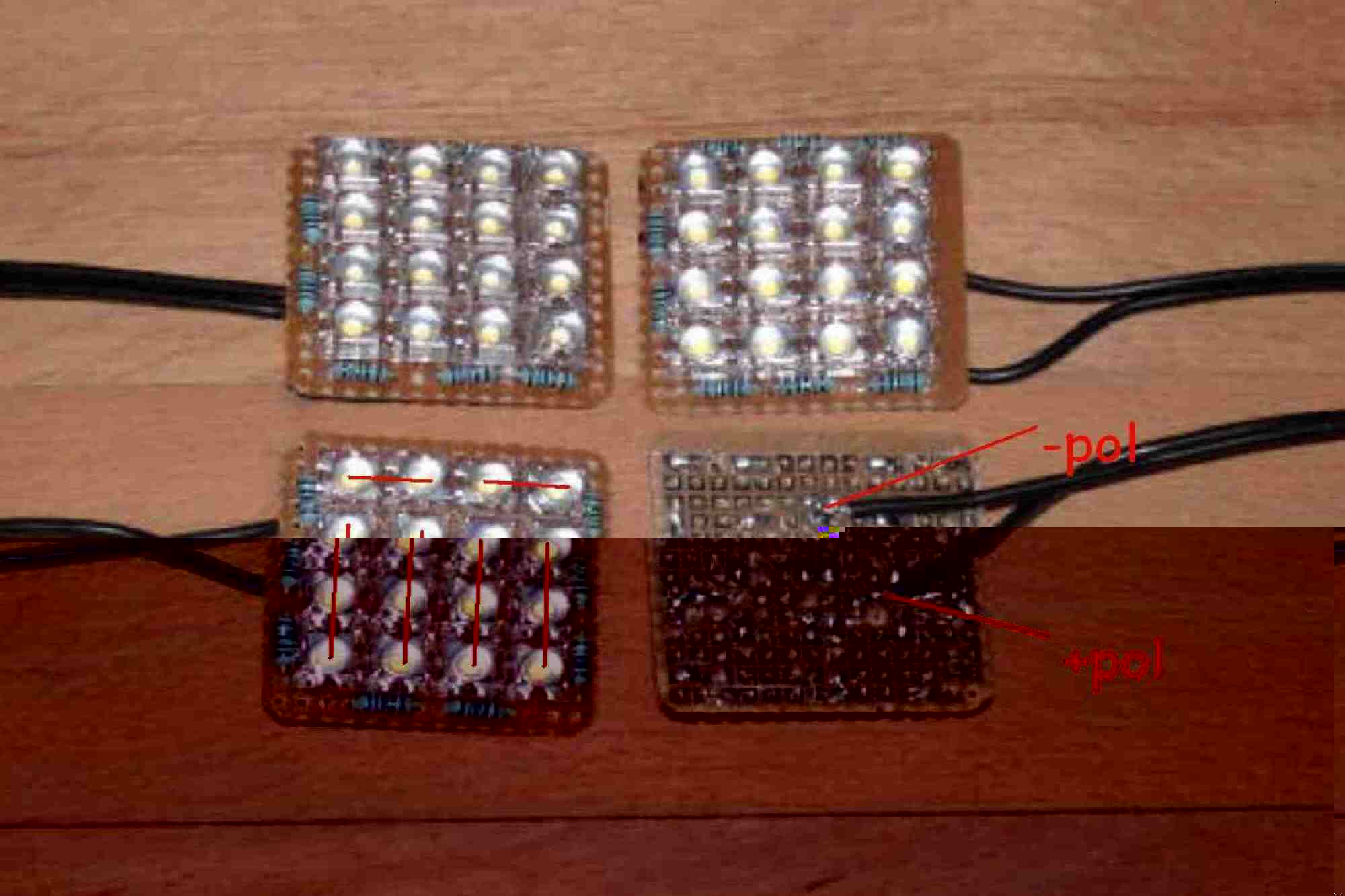 in Reihe vor die Leds gelötet :wink:.Die Ledreihen sind so auf der Platine angeortnet das sich die Minuspole alle an einer Stelle treffen.An dieser Stelle sowie an dem gemeinsamen Pluspol