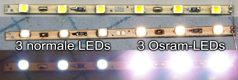Die Osram-Leds haben ca. 5lm, aber das schon bei 20mA und einer Leistenbreite und -höhe von 3mm. Somit eignet sich mein Leistenumbau für kleine TFT super, da man einfach die Röhre gegen die Leiste tauscht und gut.