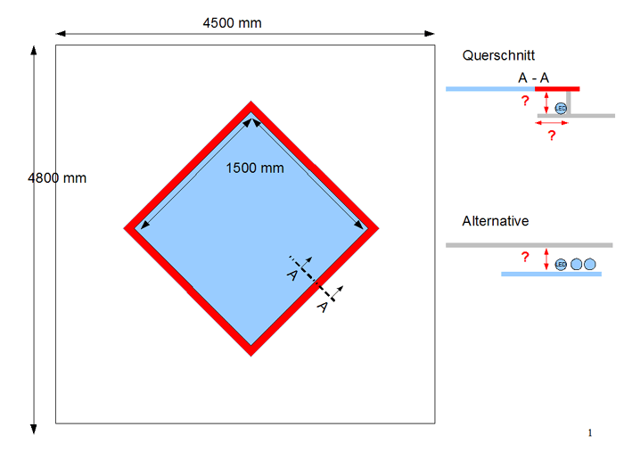 Ich möchte eine einen Teil der Wohnzimmerdecke nach oben hin aussparen und durch indirekte Beleuchtung der Decke das Feld dann mit RGB-Technik farblich gestalten (also mit Farbwechselmöglichkeit). Da ich bisher keine Erfahrung mit LED-Technik habe, weiß ich jetzt nicht genau, welche LED-Systeme hier sinnvoll sind, insb. weil die zu beleuchtende Fläche 1,5m x 1,5m beträgt und eigentlich größtenteils beleuchtet sein soll. Mir ist klar, dass die Lichtstärke näher an der LED natürlich stärker ist, als in einem Meter Entfernung, aber wenn es nur 30 cm von der LED beleuchtet ist, sieht es nicht so toll aus. Anbei ein Plan wie ich mir die Deckenkonstruktion vorstelle.