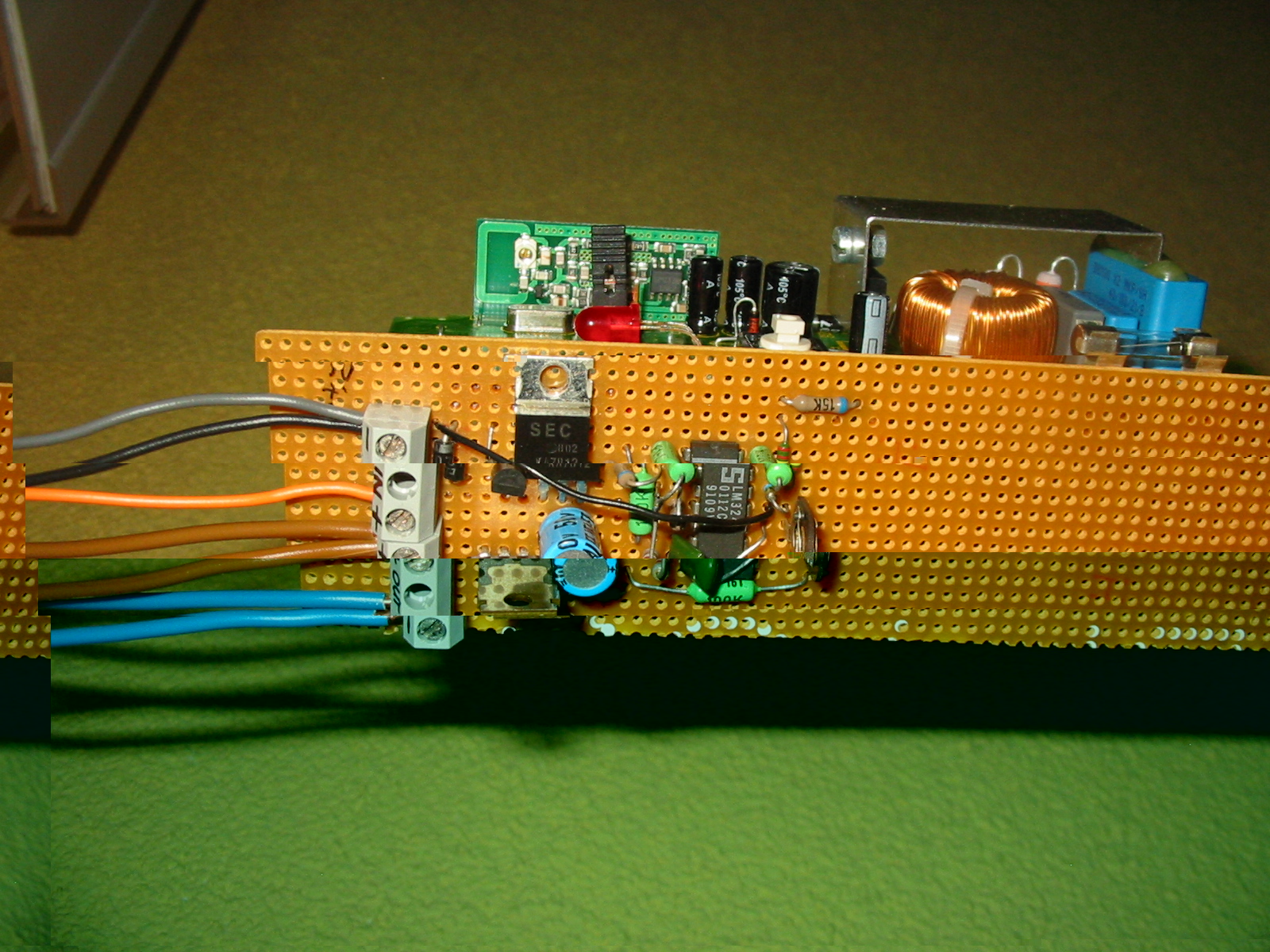 Mitte hinten ist das Funkmodul, davor ein Jumper, ein Programmiertaster und Status-LED, der Rechte 230V-Teil der hinteren Platine (Kühlkörper, Drossel, Sicherung) ist totgelegt. Auf der Lochrasterplatine ist der 4fach-OPV, ein Leistungs-FET und etwas Stromversorgung (12V für OPV und 3,3V für Funkmodul) untergebracht.