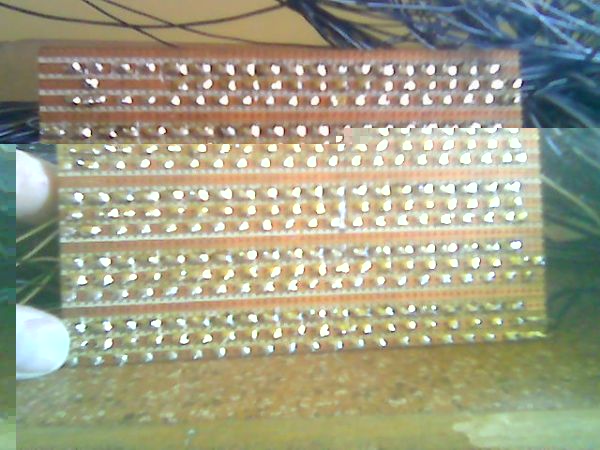 Mal abgesehen davon, das das Bild total unscharf ist und man dadurch so gut wie garnichts erkennen kann würde ich mal sagen, das du dir viel zu viel Aufwand gemacht hast. Wie ich sehe hast du die LEDs nicht direkt auf die Platine gelötet, sondern nur die Widerstände dort befestigt. Dann hättest du auch keine Platine gebraucht.