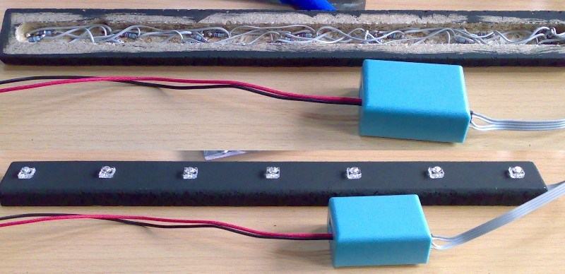 Dann gings los. Eine Holzleiste 32 x 3cm zugesägt, von unten eine 30cm lange Vertiefung eingefräst und die oberen Kanten angefast. Jeweils 4 Stück 2mm Bohrungen für die insgesamt 7 LEDs gesetzt. Schwarze Farbe drauf, LEDs durchgesteckt und von hinten in der Vertiefung entlang verdrahtet. An jede LED kamen erstmal nur 22ohm Widerstände. Das reduziert die Abwärme der Widerstände direkt an den LED-Pins. Dann alles parallel verschaltet, und über Flachbandkabel herausgeführt.