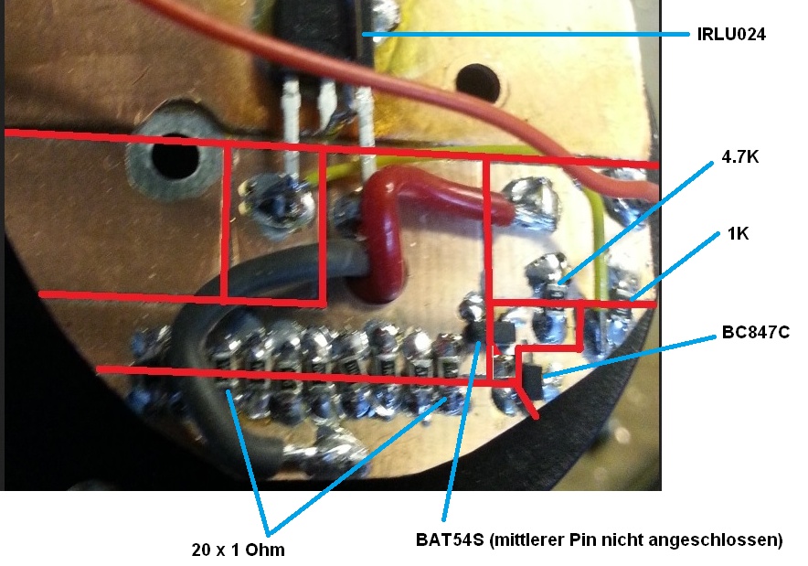 Bei den 1 Ohm Widerständen sind je zwei übereinander gelötet. Um den Strom zu erhöhen gibt es mehrere Möglichkeiten.