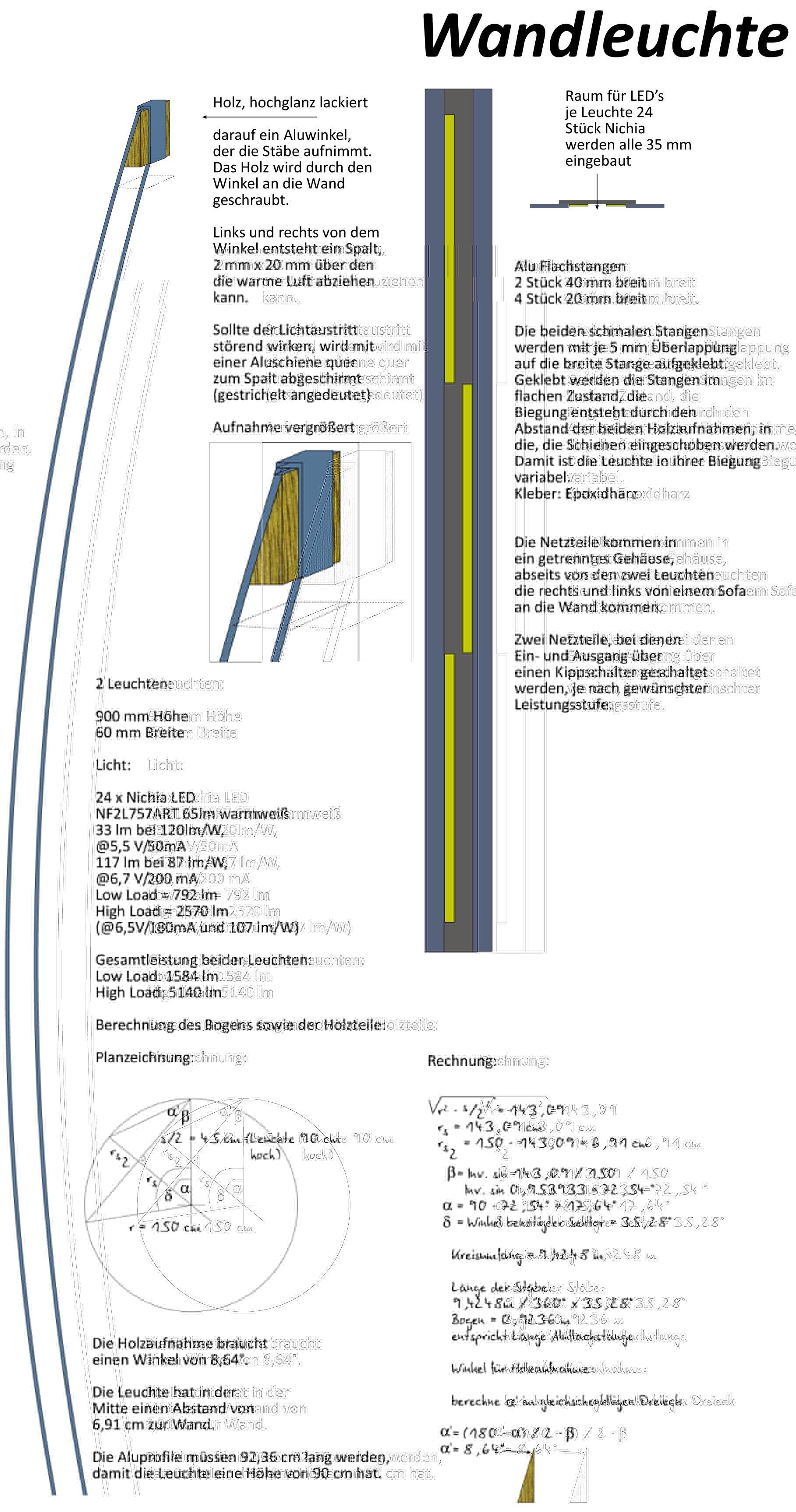 Hatte in Mathe Leistungskurs 15 Punkte (Naturtalent deshalb auch besonders schlampig), werde den Winkel berechnen, das geht schneller und ist exakter. Zumal ein reiner Winkel nicht reicht, ich brauche an sich einen Bogen bzw. ein Kreissegment. Aber das werde ich mir sparen. Ich habe die Winkel schon berechnet, habe ich gebraucht um die Länge der Stangen zu berechnen, denn die sind geringfügig länger als die tatsächliche Höhe der Leuchte. Das macht zwar nicht besonders viel aus, weil ich nur einen Sektor von 35,28° aus 360° bearbeite (noch auf den Radius von 99 cm bezogen). Da ich jetzt aber einen Radius von 150 cm verwenden möchte, wird der Wert noch etwas schrumpfen, weil die Sehne bzw. Sekante durch den Kreis noch näher an den Kreisbogen rückt, womit der Sektor bzw. das Segment anteilig an der Kreisscheibe kleiner wird.