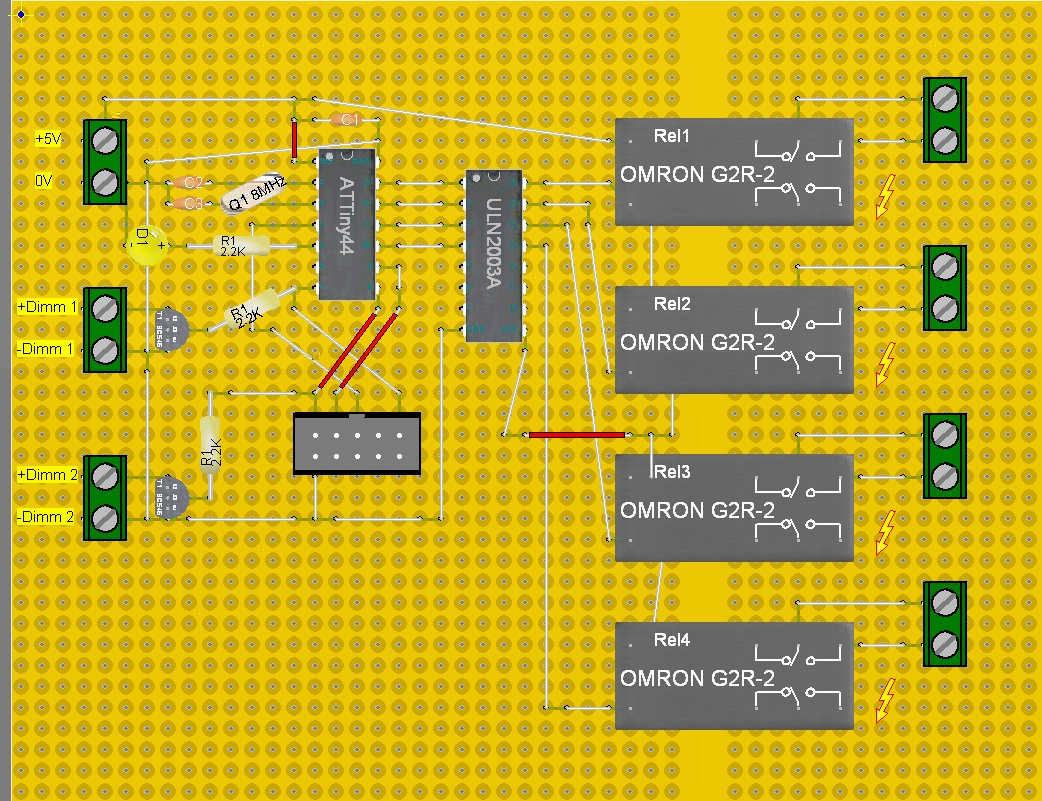 Das Platinenlayout mache ich dann noch 'endgültig' fertig wenn die Bauteile bei Dir angekommen sind. Möglicherweise sind z.B. die Relais ein wenig anders als die hier in Lochmaster schon vorhandenen OMRON G2R-2. Danach bekommst Du auch noch die Unterseite der Platine :)