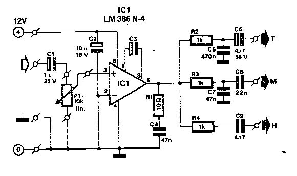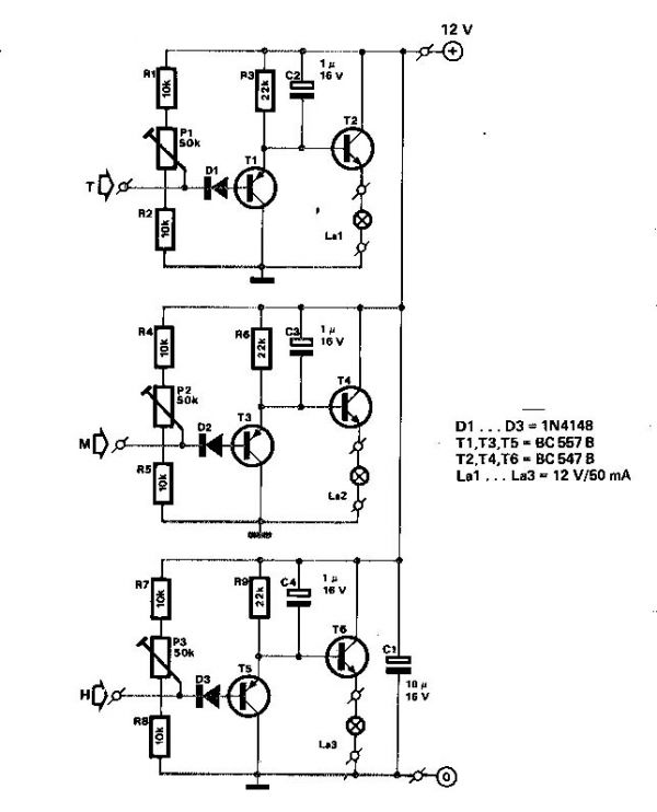 Die Frequenzweiche teilt das Audiosignal in 3 Teile auf, der Intensitätsregler übernimmt die Helligkeitsregelung und die Steuerstufe steuert hier eine Glühbirne an (12V, 50mA). Diese Stufe müsste noch auf den LED-Betrieb angepasst werden ...