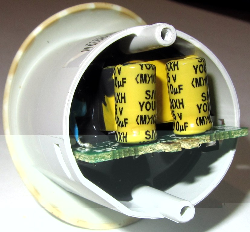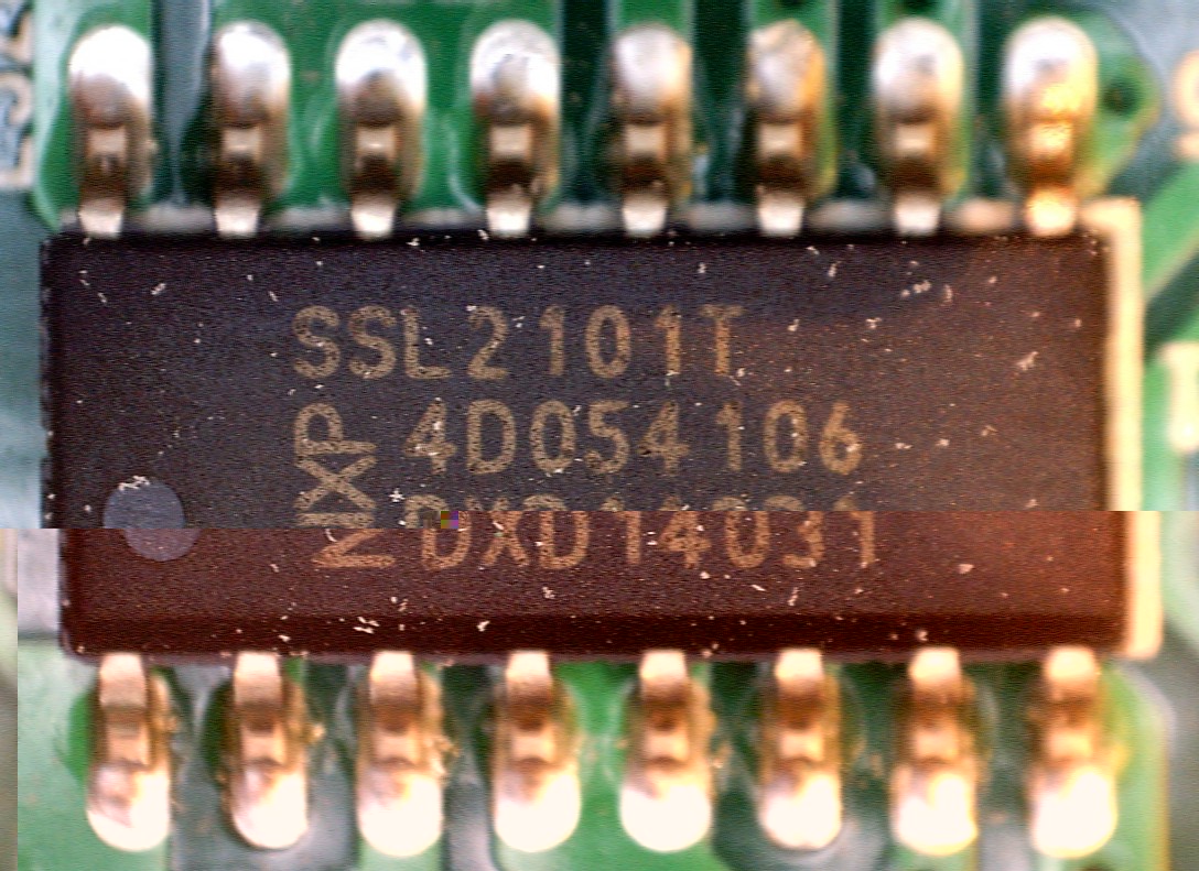 Im unteren Bereich des Strahlers befindet sich das Schaltnetzteil (bzw. die KSQ): Bauteilseite: Lötseite: Das Gleiche nochmals mit den bedrahteten Teilen zur Seite gebogen: Bei dem IC handelt es sich um ein SSL2101T: Datenblatt und Application Notes sind hier zu finden: