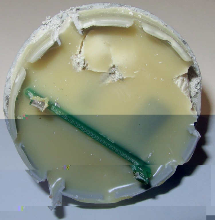 Im Sockel befindet sich ein Schaltnetzteil (KSQ), das allerdings mit einer ziemlich harten Vergussmasse vergossen ist: Ein weiteres Freilegen der KSQ wäre zwar mit einem Dremel und entsprechenden Aufsätzen möglich, aber mit einem sehr großen Zeit- und Arbeitsaufwand verbunden. Deshalb habe ich darauf verzichtet. Im Betrieb habe ich zwischen TP1 und TP2 auf der LED-Platine eine Spannung von 11,55 V gemessen. Damit liegt die Vorwärtsspannung der LEDs bei 2,9 V. Anhand der Effizienz der LEDs (121 lm @ 350 mA) und der erzielten Lichtleistung kann man eher von einer mäßigen Effizienz der KSQ ausgehen.