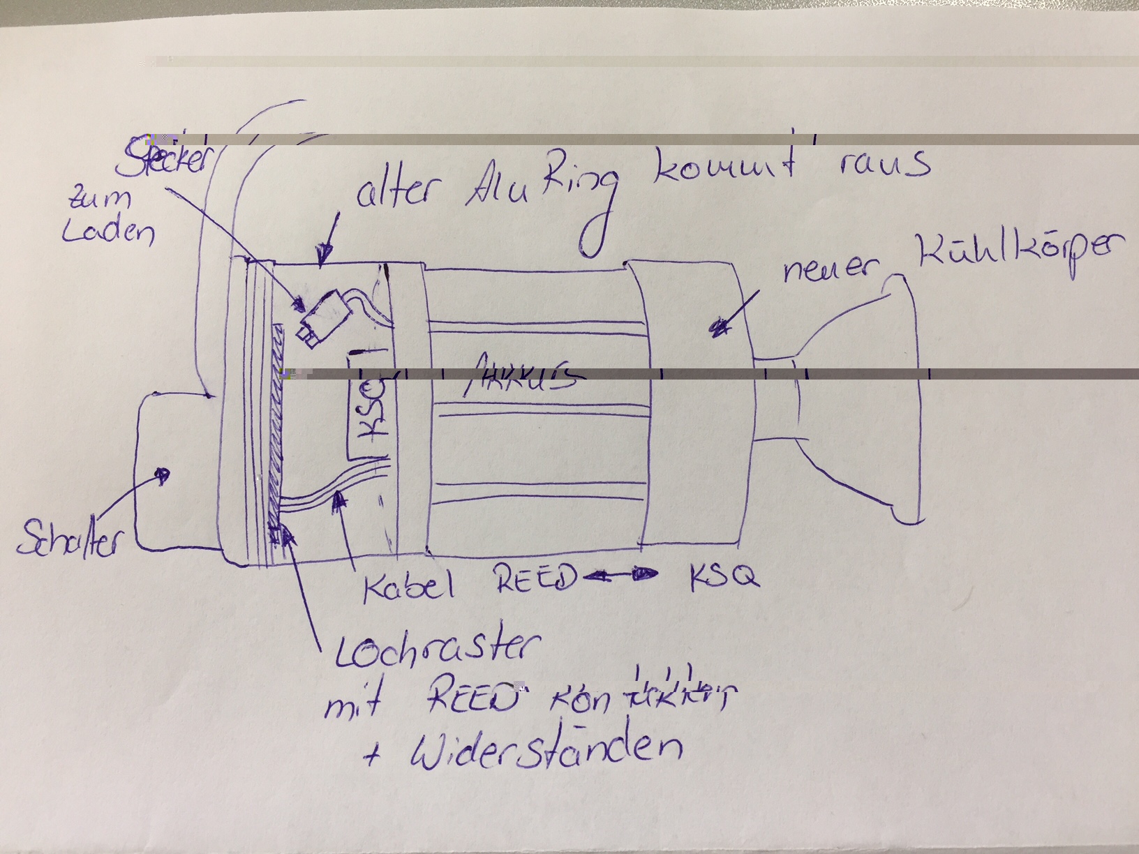 Warum? Wenn ich mir dieses Bild anschaue, ist doch der 'untere Teil' mit Drehschalter und REED Kontakten noch zusammen, nur oben ist der Akku-Anschluss zugänglich: Eigentlich könntest Du ja auch das alte Stecksystem so lassen?Ich muss ja die Lampe öffenen, somit ist auch der Reed Kontakt der die KSQ auf Masse schaltet nicht geschaltet und somit auch die KSQ aktiv.