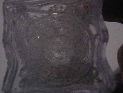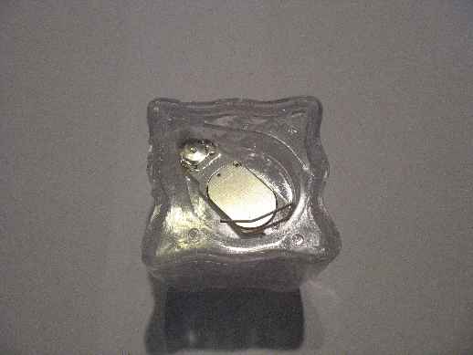 Das "Versuchsobjekt": Von der Seite. Links ist oben, rechts unten der Deckel: Vorsichtig den Schraubendreher ansetzen: "Knack", und der Klebstoff ist besiegt. Gut sichtbar das Polster, das die Knopfzellen hält. Rechts oben die Verlängerung für den Schalter: Die Knopfzellen, darüber ein Draht von der Platine: Weg mit den Baterien, sichtbar die Platine: Mal rausnehmen...aha, eine 5mm-LED und ein vergossener IC: Rückseite; links der Schalter: Blick ins innere des Würfels. Dicht abgeschlossen das Kühl-Gel mit Kunststoffkram drinne (Lichtstreuung): Die Knopfzellen (CR2016):