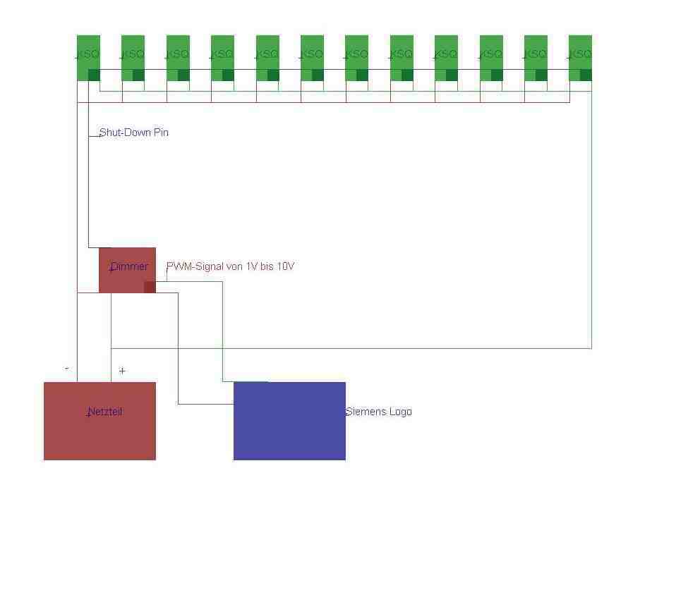 Zum Plan erstmal soviel. Alle KSQs werden eingangsseitig parallel verschaltet und an das Netzteil geklemmt. Der Dimmer wird eingansgseitig ebenfalls ans Netzteil gehängt.