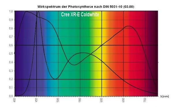 Das Problem bei Kaltweißen leds ist dass der zweite Peak im Spektrum genau dort liegt wo er nicht sein sollte und zwar im Photosyntheseminimum: