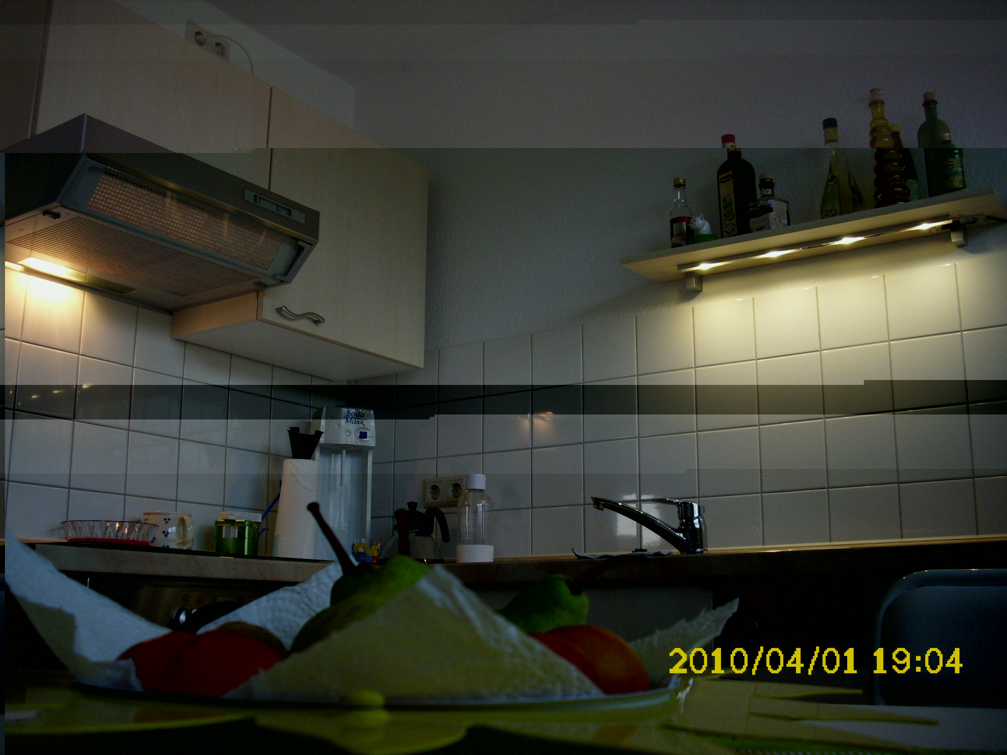 - Vergleich 25W-Kerzen-Glühlampe vs. 5,6-Watt (ab Steckdose) LED-Leiste (4x Cree XR-E @ 350 mA, 4,5W gehen in die LEDs + KSQ, 380-390 mW davon in die KSQ, wobei davon wiederum allein 300 mW in den Basis-Vorwiderstand des PNP-Transistors gehen...)