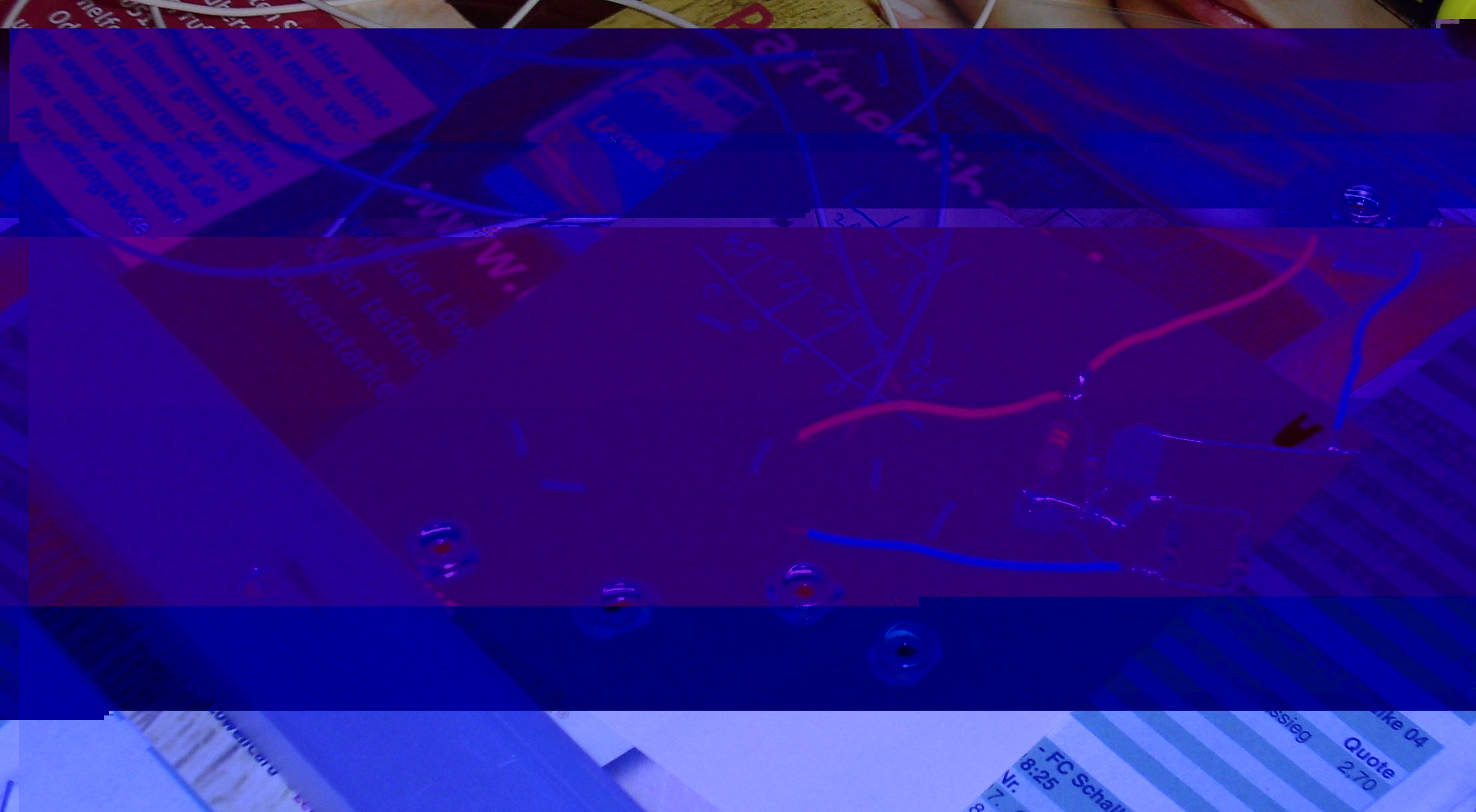 - LED-Leiste testweise auf dem Sofa, mit den Schoko-Riegeln habe ich 3 der 4 LEDs über eine Stunde lang abgedeckt --- sie sind nicht geschmolzen, nichtmal weich geworden, das Alu-U-profil erreicht nichtmal Körpertemperatur (350 mA durch die LEDs, alle 20 cm eine LED, U-Profil 20mm breit, Kanten 10 mm, Stärke 2 mm