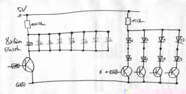 So nun hab ich die Idee gehabt für jede Farbe (4 x 2 Rot / 8x Grün) einen Wiederstand zu verbauen. Sprich meine Betriebsspannung ist 5V, von den Roten 2,2V 20mA und von den Grünen 3V 20mA das wären dann bei den Roten 15Ohm und bei den Grünen 100Ohm