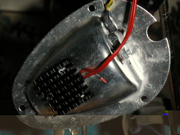 Also das ist die Elektronik, habe ich testweise mal so aufgebaut um Festzustellen das der Kühlkörper des Spannungsregler viel zu klein ist (Wenns zu rauchen anfängt ist schlecht). Also hab ich den Spannungsregler von der Platine runtergelötet und kurzerhand an den Alu Reflektor der Lampe gelötet der zur genüge die Wärme abführen kann. In den Reflektor der Lampe habe ich ein Loch gebohrt wo die Linse der K2 genau durchpast. Das man auch mal sieht wie die Lampe ausschaut. Die Elektronik hate gerade noch so in das Gehäuse gepasst. Das ist das einzigste was man dann von der K2 sieht. Und hier noch das ganze im Betrieb (schaut dunkel aus, ist es aber nicht). Ist dann in etwa so hell wie die 20W Halogenlampe.