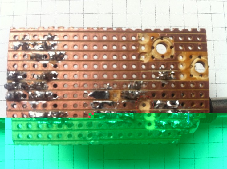 In der Nähe des dritten Potianschlusses von unten habe ich einen roten Kreis eingezeichnet. Da könnten noch Kupferreste stehen. Eine gute Idee wäre zunächst einmal mit einem Multimeter im 100 bzw. 200 Ohm Bereich benachbarte Leiterbahnen auf Kurzschluss zu überprüfen, Jeder niederohmige Wert (z.B. < 50 Ohm) deutet schon mal auf ein Problem hin.