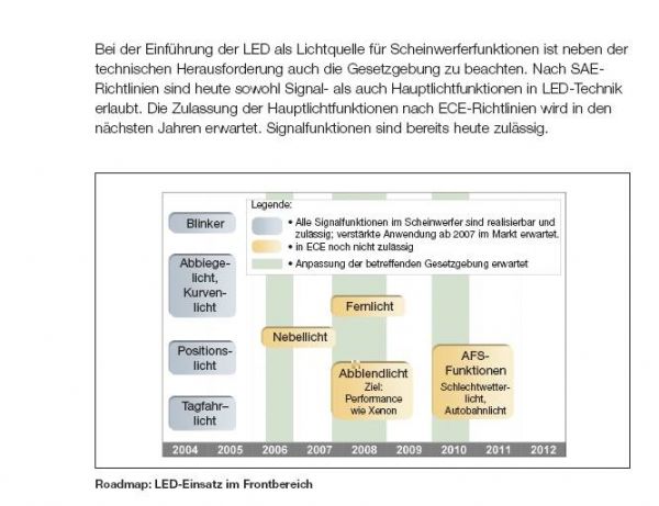LEDs in der rückwärtigen KFZ-Beleuchtung sind ein alter Hut. Bereits 1991 (!) hatte der Cadillac Seville als erstes Serienauto eine 3. Bremsleuchte mit LEDs. (Da waren 3. Bremsleuchten hier noch strengstens verboten.).