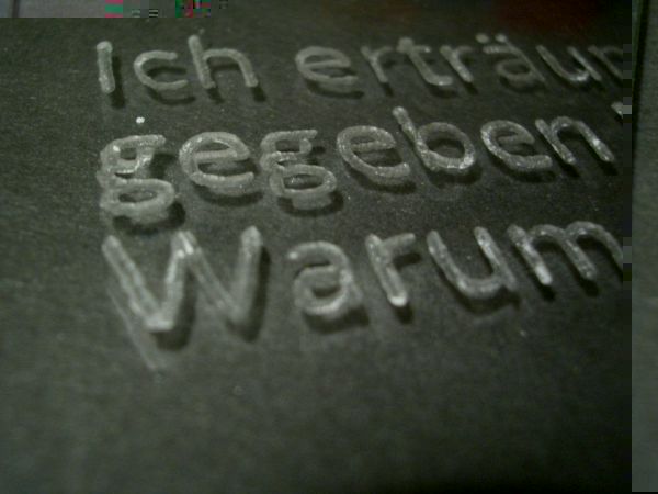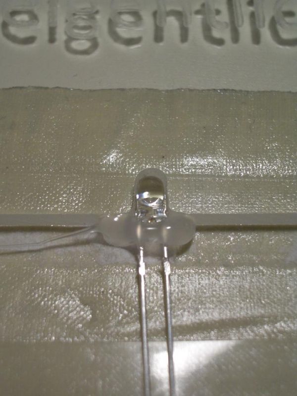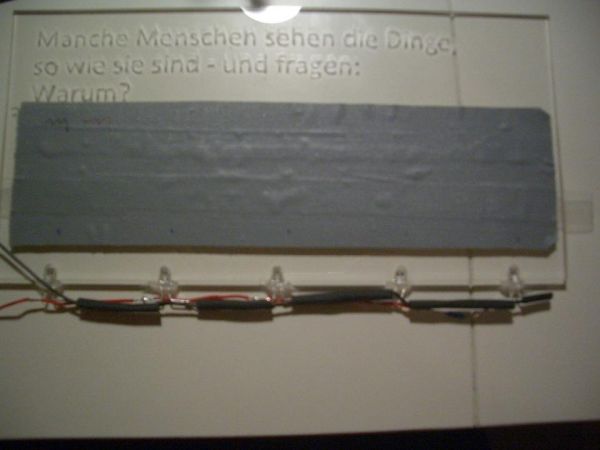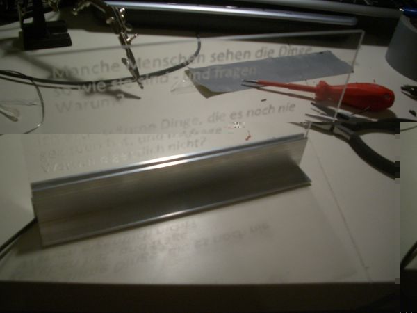 Ich hab also erstmal mit einer 1 mm proxxon Gravurspitze die Schrift graviert. Danach die Ausssparungen für die LEDs "reingedremelt" und LEDs reingeklebt, dann siehts so aus