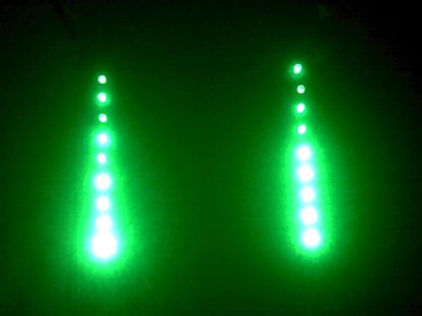 So dann hätte ich da noch eine 2. Idde, und zwar würde ich auch gerne mein schreibtisch anders weitig beleuchten, und zwar auch mit Led leisten, hatte mir da schon mal was ausgedacht, also eine länge von 26cm pro leiste mit je 9 Led's drine mit einem abstand von jeweils 3cm, und der am Rand sitzende abstand beträgt auf jeder seite 1cm also insgesammt 2cm ;-). So hier ist mal mein Muster, G-W-G-W-G-W-G-W-G, dabei steht das G für Grün und das W für Weiß, nun weis ich nicht wie das herrauskommt im endefekt, das muss ich noch einmal austesten, evtl. wirds auch anders mit der Farbverteilung, aber ich denke mal 9 Led's werden schon pro leiste hinein kommen, und wie viele leisten ich baue weis ich auch noch nicht so richtig, aber 3 stück ganz sicher, das steht fest. Also was haltet ihr von der Farbkombi Grün und Weiß?, ich weis halt nicht wie es aussehen würde, deswegen werde ich das noch mal austesten, wenn es mir zu weiß ist kommt halt mehr grün, und das selbe dann auch umgekehrt.