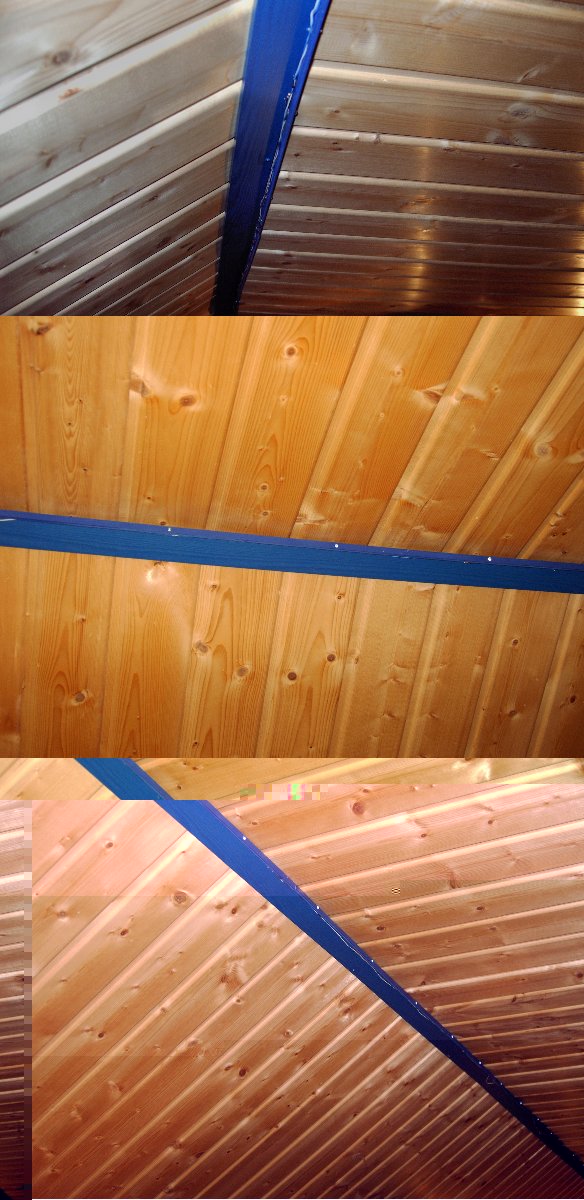 Die Decke und eine Wand ist aus Holz, das man auf den Bilder sieht und dann sind halt noch blaue Abdeckleisten, die die Kanten abdecken!