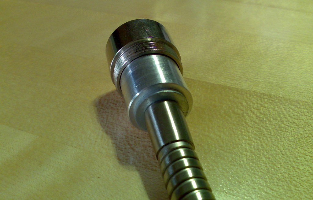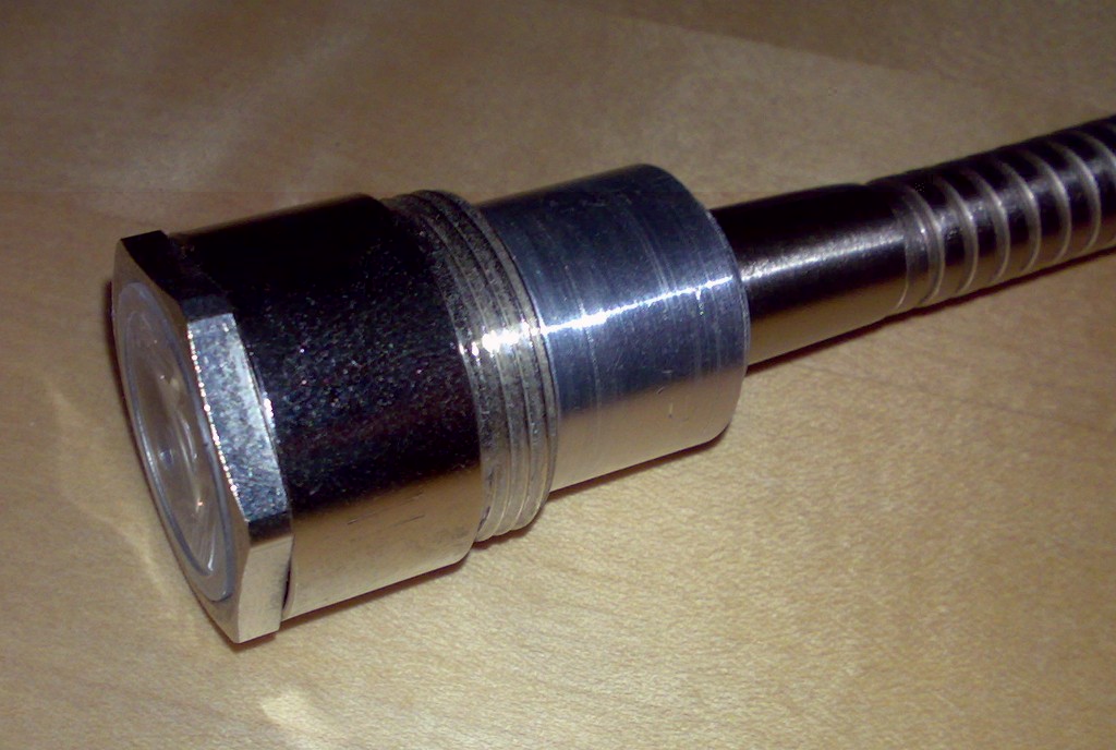 Um das ganze an den Schwanenhals zu bekommen, hab ich noch kurzerhand einen Adapter aus Aluminium gedreht. Hinten kam ein 1/8 Zoll Feingewinde (exotischer Kram) für den Schwanenhals rein und vorne der Einfachheit halber mit Loctite 601 in die Verschraubung und gut: