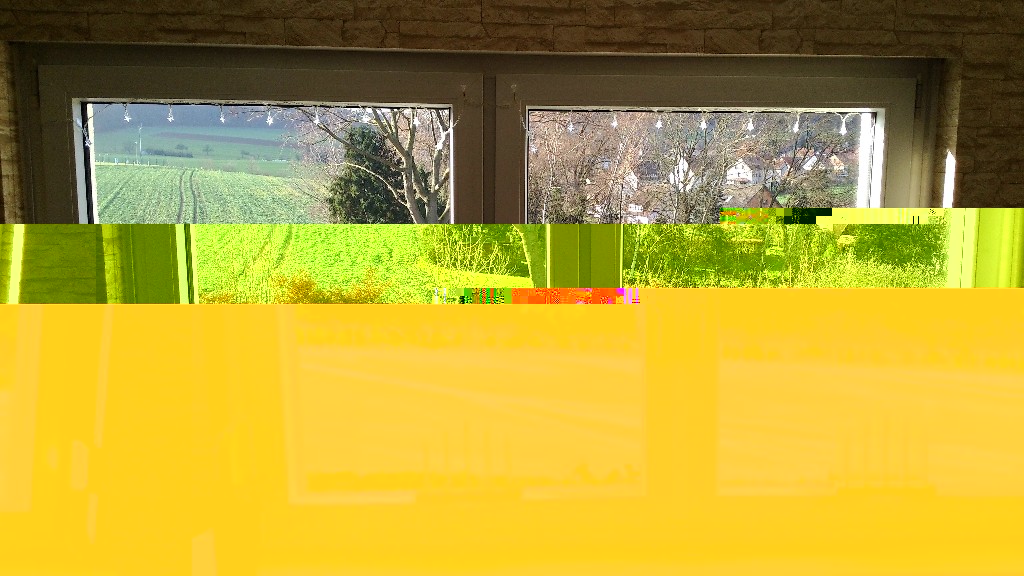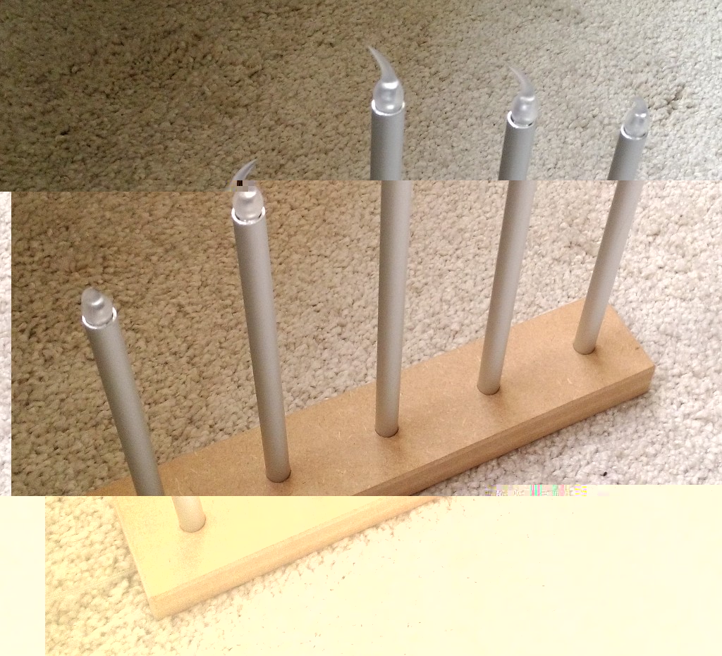 Neben der Tannebaum-Lichterkette, die aktuell noch nicht im Einsatz ist, standen auf der letzten Bestellung noch die batteriebetriebene Stern-Lichterkette und zehn gelbe LED-Teelichter mit drauf. Die wurden aber natürlich nicht ganz normal verwendet, sondern erstmal zerlegt: Geht recht einfach. Ist bis auf eine Schraube am Batteriefachdeckel alles nur gesteckt. Benötigen tue ich nur das Kerzenflammenimitat und die Flacker-LED. Letztere wird mit einem Stück Zwilligslitze plus 200 Ohm Widerstand versehen. Dazu noch abgelängtes 10mm Alu-Rohr und nen Holz-Fuß: Die Kabel laufen unten in einer eingedremelten Nut. Fertig eingefädelt siehts dann so aus: Nun noch die Kerzenflammenimitate aufstecken. Mit ihren flexiblen Haken lassen sie sich stramm in das Rohr drücken und brauchen keinerlei zusätzliche Befestigung: Die Lichterkette wurde nur von ihrem Batteriefach befreit und der nackten Parallelschaltung wegen mit großzügigem 22 Ohm Widerstand auf 5 mA pro LED an 5 V ausgelegt. Im Fenster siehts bei hellem nun so aus: Bild bei Dunkelheit könnte noch folgen, wenn ich mal dran denke