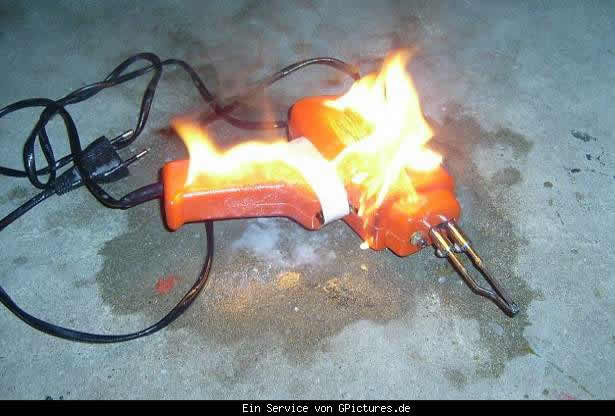Es ist natürlich kein Wunder, dass die Lötpistole zu brennen angefangen hat. Mit Klebeband den Schalter fixiert. Diese geräte sind nicht für dauerlauf ausgelegt. Auch wenn zwischen den einzelnen Lötvorgängen nur 20 -30 sek. liegen kann das Gerät wieder ausreichend abkühlen. Und selbst dann noch wird das Ding ganz schön Heiss auf die Zeit.