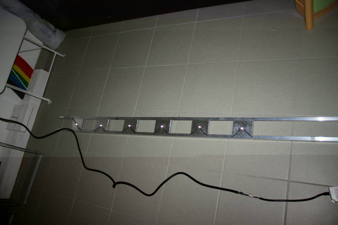 ich bin gerade dabei mir eine LED-Beleuchtung für meine Aquarien zu bauen. Bislang habe ich 8 Cree XHP50 High-power-LEDs auf Kupferkern-Platinen auf Alu-Kühlkörper geklebt und diese mit Alu-Winkelleisten verbunden. Das Ganze hat eine Länge von 250cm, vgl. Bild. Zwei LED-Module sollen ein 100cm-Becken beleuchten, die sechs weiteren ein direkt daneben platziertes 160cm-Becken.