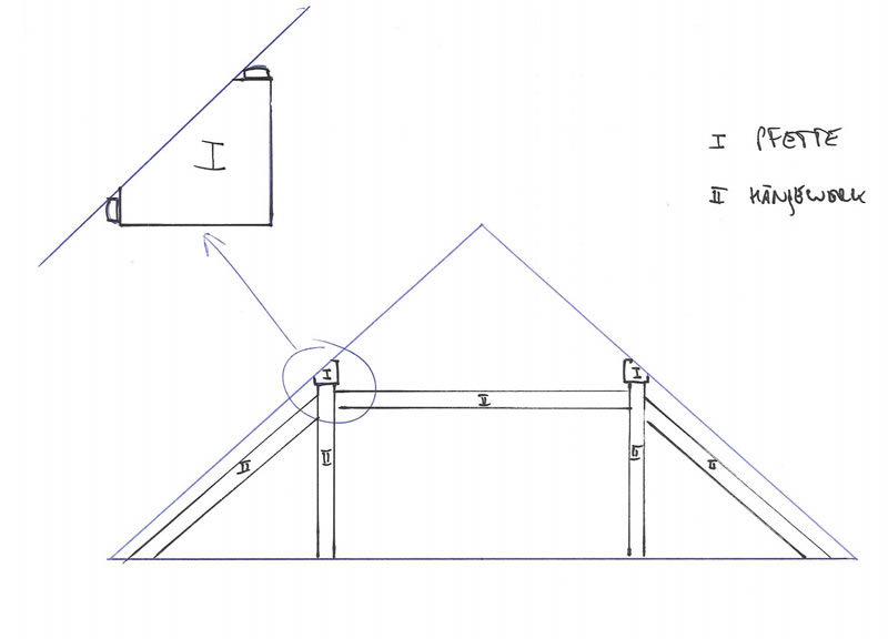 Die Hängewerke, so wie sie hier eingezeichnet sind, kommen alle 5m. Dazwischen gibt es nur die Pfette I (und Detail). Hier soll oben und hinten die Leiste befestigt werden, die Pfette befindet sich auf ca. 2,5m. Die Wände werden weiß, der Fußboden entweder Eiche oder Lärche. Die Abdeckung soll das Licht eigentlich nur gleichmäßiger machen.