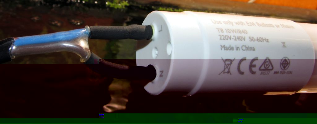 Beispiel "Philips CorePro LEDtube 600mm 10W neutralweiß" als Zusatzbeleuchtung fürs Aquarium: Gut zu sehen im Bild: der herausquellende Kleber.