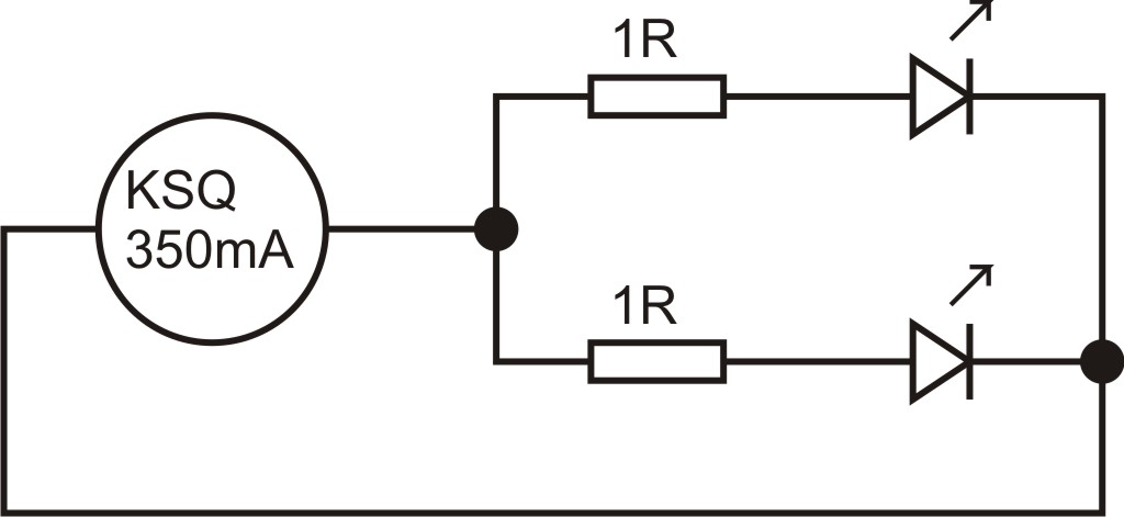 Bei erster Inbetriebnahme misst man den Spannungsabfall über den Widerständen. Wenn sich (im Idealfall) der Strom der KSQ von 350 mA gleichmäßig über beide COBs aufteilt, fällt über jedem Widerstand eine Spannung von 175 mV entsprechend 175 mA ab. Misst man über dem einen Widerstand z.B. 160 mV und über dem anderen 190 mV, dann teilt sich der Strom auf 160 mA im einen und 190 mA im anderen Zweig auf. Das wäre noch nicht tragisch, könnte man aber durch Ändern der Widerstände ausgleichen. Bei größeren Abweichungen müsste man ausgleichen.