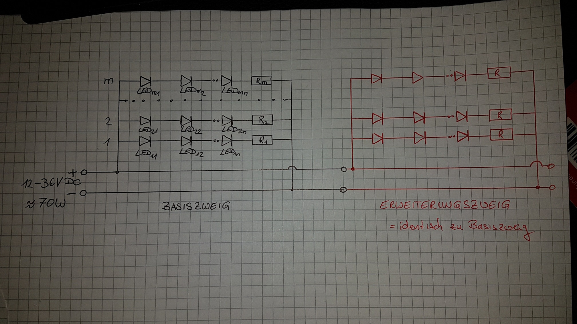ich plane aktuell eine Stehmĺampe, die mittels LEDs beleuchtet werden soll. Besonderheit: die Lampe soll um weitere LED-Leuchteinheiten modular erweitert werden können ohne dass an der Schaltung etwas verändert werden muss. Anbei ein rudimentärer Schaltplan, wie ich mir das vorstelle. Dazu noch folgende Infos: