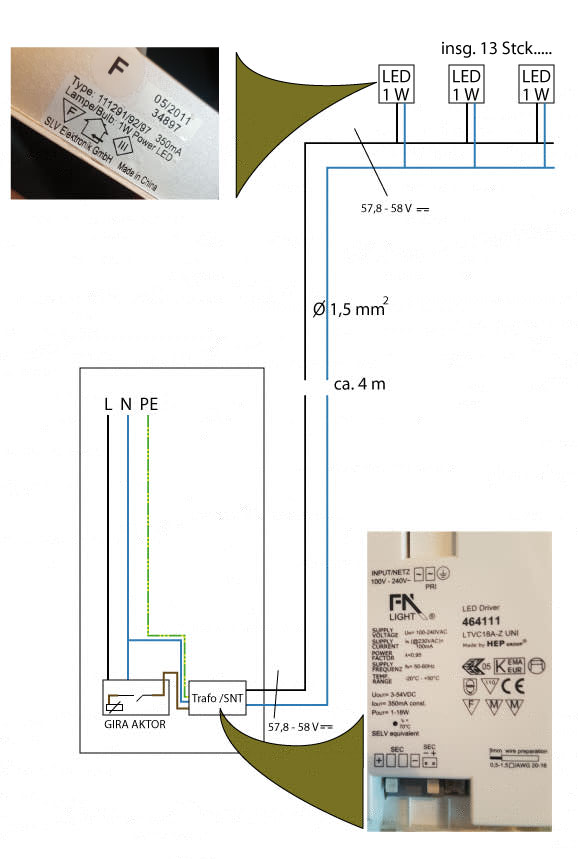 So nun habe ich versucht den Fehler zu lokalisieren. ich habe den Gira Aktor durchgemessen...... der schaltet.....ist nur ein Schließer. Dann den LED Driver gemessen und der bekommt zuleitungsseitig 230 V und Abgangsseitig hat er 57,8 V. So nun dachte ich mir das die Leitung in den ersten Stock defekt ist, da sich Gira Aktor und LED Driver im Schaltschrank im Keller befinden.