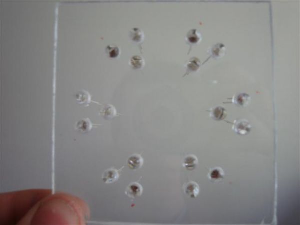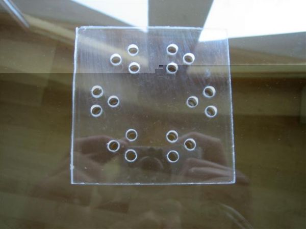 Zuerst hab ich in eine Plexiglasplatte 18 Löcher gebohrt.