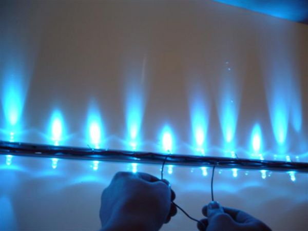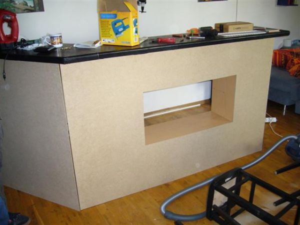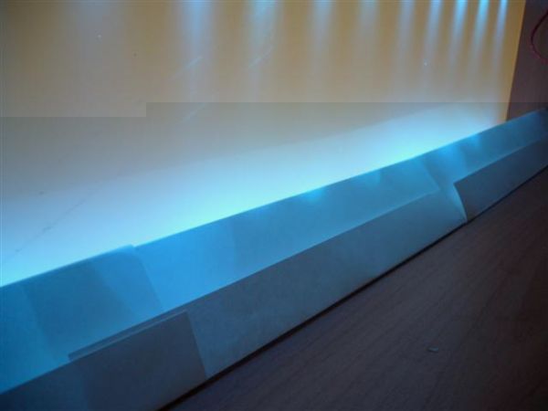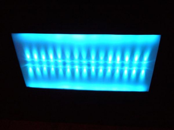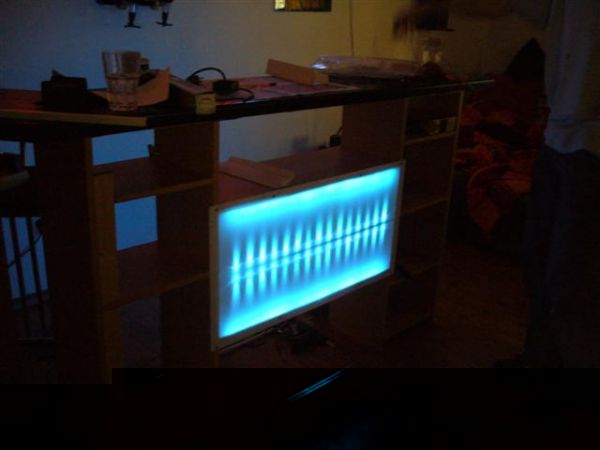 Bar vorher, die alte Front bereits abgenommen: Plexiglasplatte für die neue Front von hinten mit blauen LEDs beleuchtet, alle parallel geschaltet: