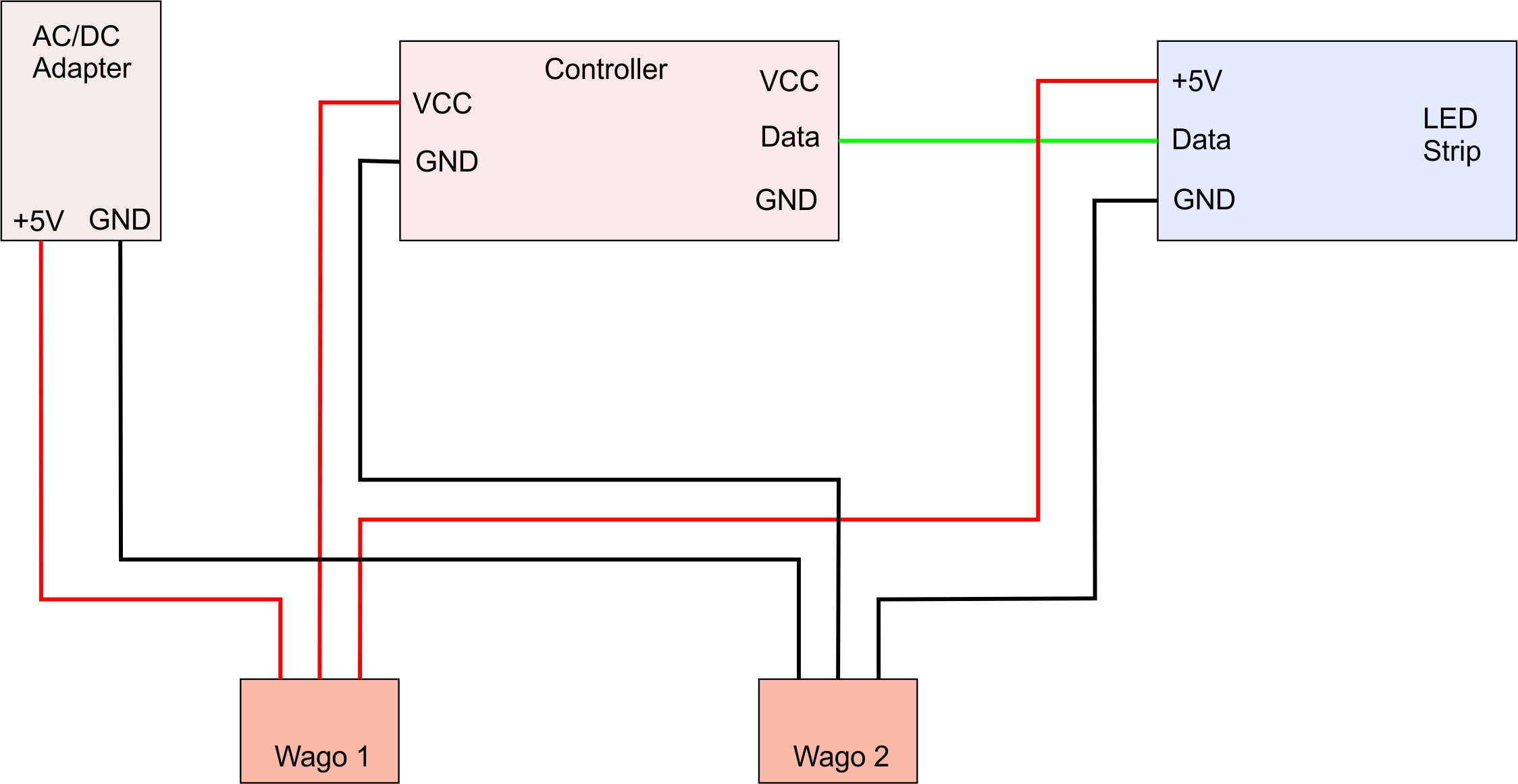 Also etwa so: Dazu müsstest du natürlich das Ausgangskabel des Netzteils auftrennen. Netzteil, Strip und Controller könntest du z.B. mit 3er-WAGO-Klemmen verbinden. Eine solche Verbindung würde ich diesen kleinen Steckverbindern ohnehin vorziehen - sind einfach zuverlässiger.