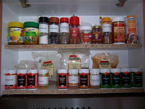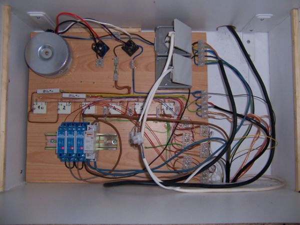 Das sieht dann so aus. Den Trafo und die Relais für die Taster-schaltungen habe ich auf einem Brett frei verdrahtet, direkt über meine Dunstabzugshaube in den Schrank integriet und hinter einem zweiten Brett, was dann ein Gewürzregal bildet, verbaut. Also Ladylike versteckt sozusagen.