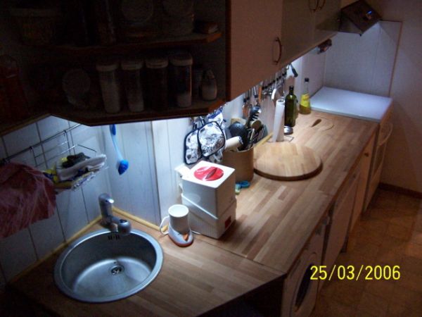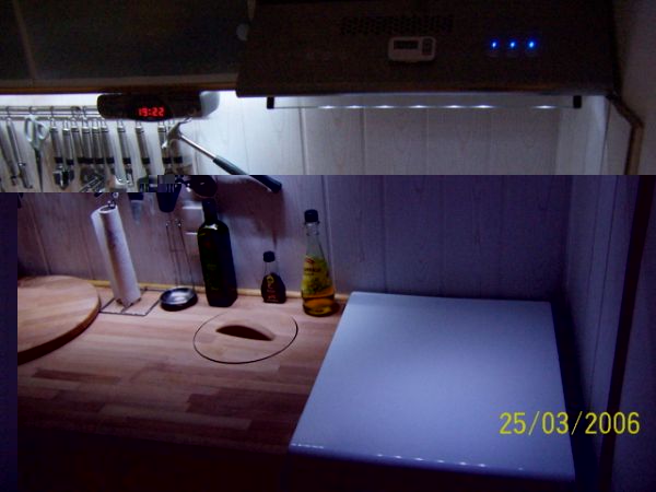 Geplant war eine innovative, einzigartige, individuelle und "kostengünstige" (dazu später mehr) Arbeitsbereichbeleuchtung in der Küche. Ich wollte keine Möbel-unterbau-strahler, oder wie diese auch heißen mögen, weil diese einfach nicht schön aussehen. Leuchtstoffröhren hatte ich in meiner alten Küche und sehen ebenfalls nicht schön aus. Ausserdem kann einem so ein Stroposkopeffekt im Halbschlaf echt zum wahnsinn treiben. Hat von euch einer dannach nochmal versucht einzuschalfen?