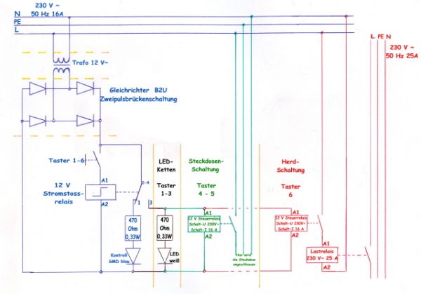 Wie versprochen; hier kommt der von Hand gezeichnete Plan. Zur Erklärung: Auf der linken Seite alles was blau gemalt, ist sozusagen die Grunndschaltung, die sich hier 6-mal wiederholt. An Kontakt 3 des Stromstoßrelais wird dann je nach Aufgabe entweder eine Led-Kette (hier in schwarz), eine Steckdosenschaltung (in grün), oder die Herdschaltung (in rot) angeschlossen. Deswegen ist der Taster auch mit 1-6 Beschriftet, pro Schaltung natürlich eben ein Taster und sechs Schaltungen sinds.