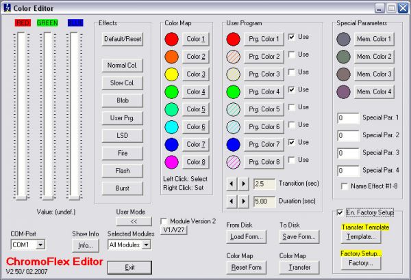 Tipp: Da das gemischte Standardorange und -gelb aufgrund der wesentlich schwächeren roten LED sehr unsauber wirkt empfiehlt es sich diese Farbwerte mit Hilfe der Schieberegler neu zu definieren. Die Farbpalette lässt sich per Druck auf „Transfer“ auf das Gerät übertragen und wird dort auch ohne angeschalteten PC genutzt.