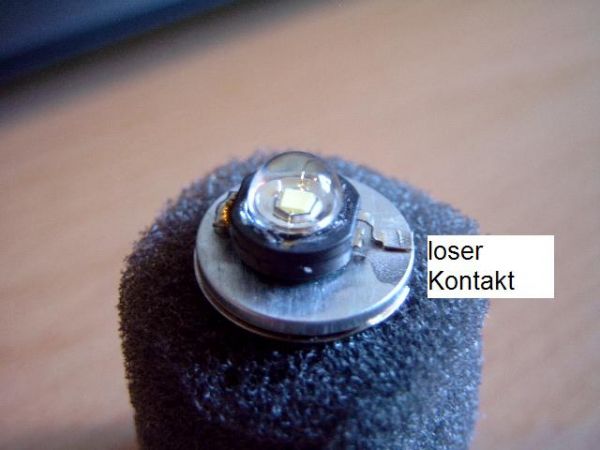 Als zweites ein Bild der Luxeon LED. Dabei gibt's eigentlich nur eins zu sagen. Der auf dem Bild rechte Lötkontakt ist lose. Das muß durch die Wärmeentwicklung verursacht worden sein denn er war vorher definitiv fest. Evtl. stammt auch die große Hitzeentwicklung noch durch den zu hohen Übergangswiderstand der dadurch resultieren könnte, aber das ist jetzt auch egal.