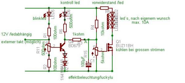 so, hier mal die fertige schaltung, das brauchst du für jede einzelne ledgruppe, dabei ist es fast egal, wieviel leds du da ran hängst. mit ein wenig mehr aufwand kann das auf wechselseitiges an und ausblenden erweitert werden!