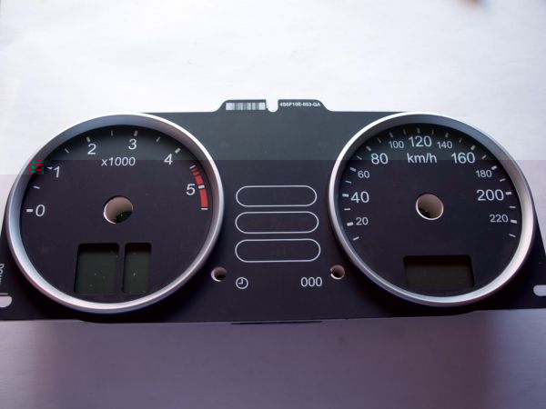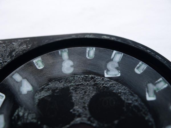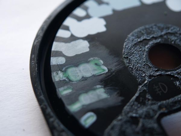 Das ist die Tachofolie von hinten. Wie man sehen kann, ist sie im Bereich der Zahlen mit einem durchscheinenden Lack überzogen. Dazu aber später mehr...